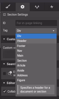 It is the tag that determines how this element is actually reflected in the html. If you set up a section tag for a section, a header tag for a header div, etc., you are more likely to receive a good SEO rating when Google crawls your page! Please check here to enhance your site's SEO.