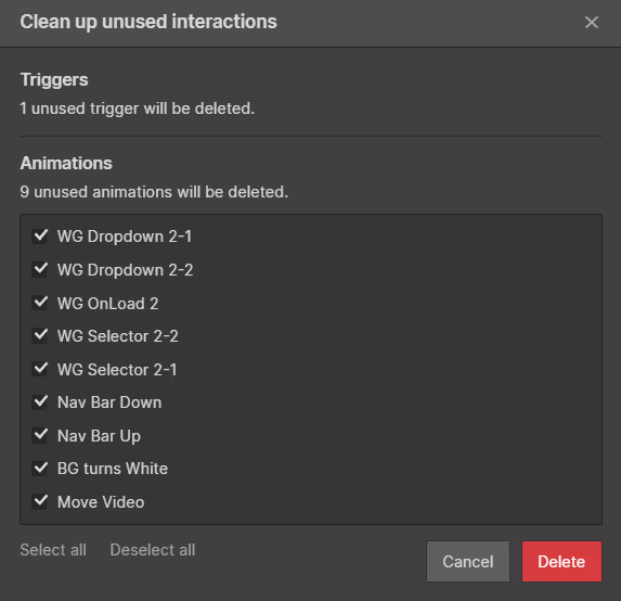 Pressing the Clean up button here will bring up a list of unwanted triggers and animations, as shown below.