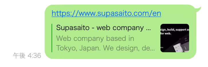 When you share a URL via LINE, a thumbnail image appears on the right side of the preview, as shown above. This article explains how to configure your website so that a thumbnail image is displayed in that way. (While "URL thumbnail image" may not be the official term, it seems to be the clearest way to describe it here.)