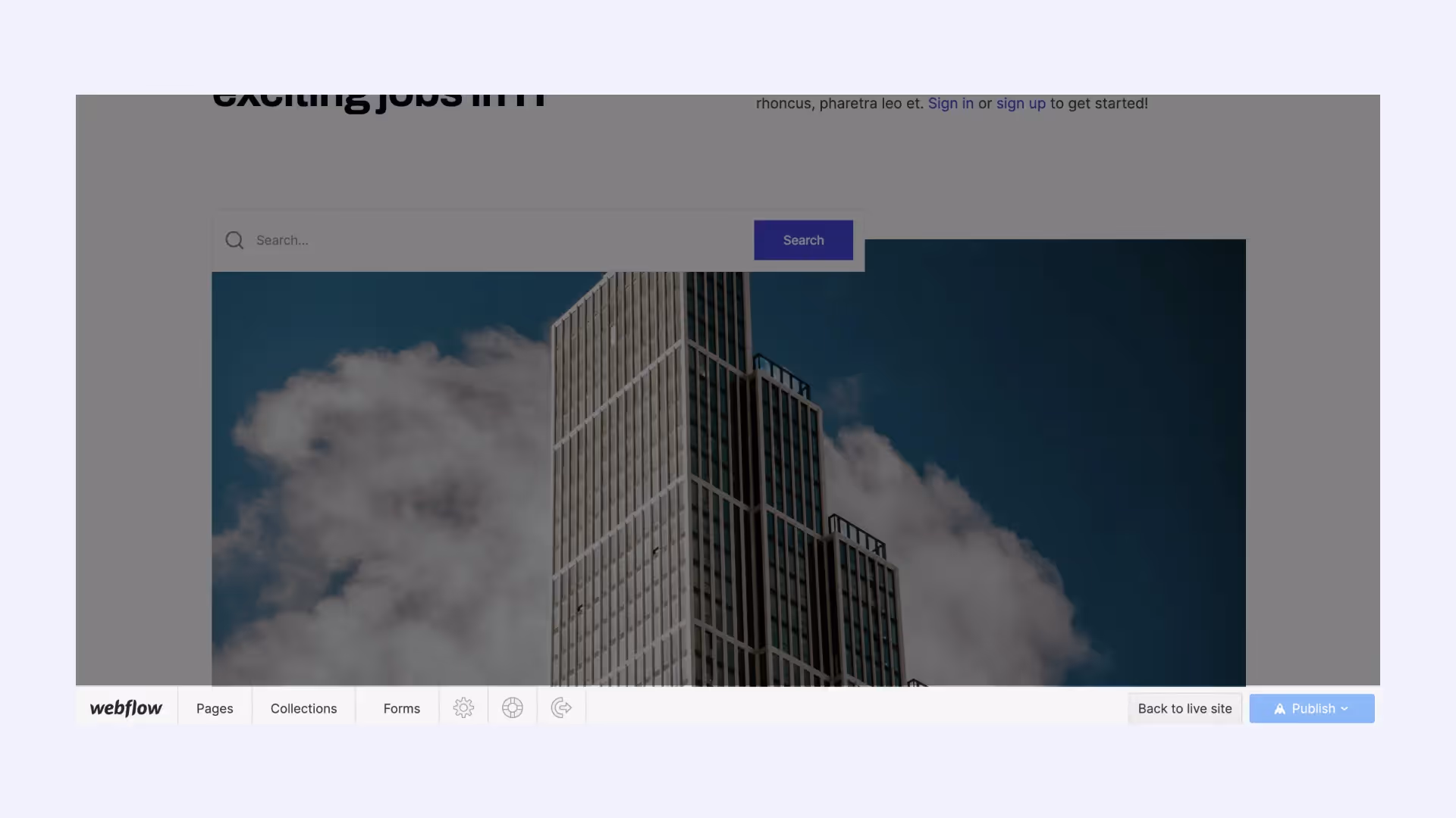 Webflow Editorは、サイトを公開した後(webflow.ioステージングサブドメインまたはカスタムドメイン)にアクセスできます。Editorでは、サイトのコンテンツをページ上で直接編集したり、エディタパネルでページやコンテンツを管理することができます。