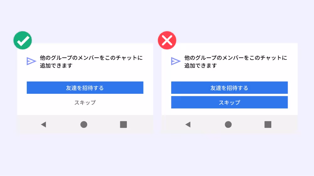 ボタンにはポジティヴなイメージになるプライマリーと、そうではないセカンダリーがあります。INVITE FRIENDSボタンは押して欲しい、SKIPはそうでない場合に押して欲しいので、ボタンのデザインは別にしましょう。