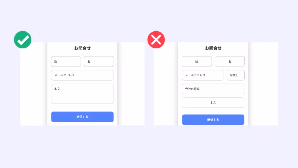 フォームのインプットフィールドに統一性を持たせましょう。そして最低限の項目のみを設置することで、ユーザーの負担を軽減します。